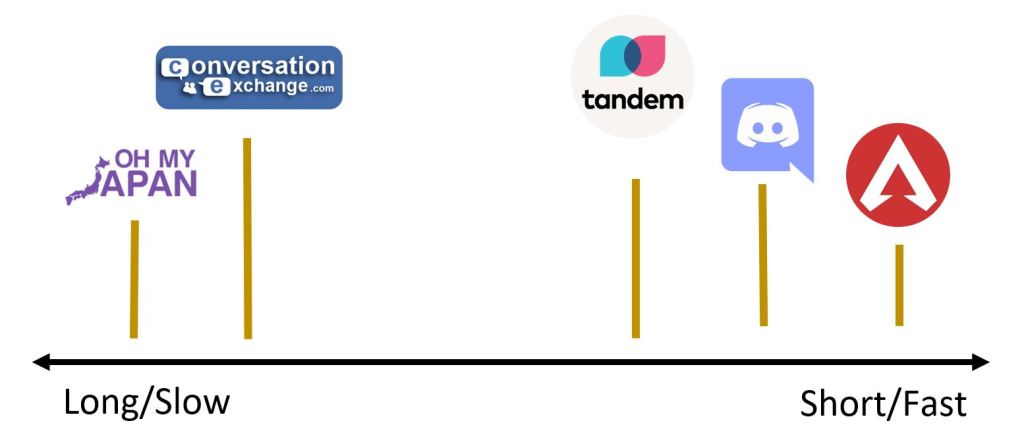 More specifically, online language exchange sites. As a self-proclaimed expert on the subject, I have made a very impressive looking graph that shows the different platforms on which you can meet, befriend, and talk REAL Japanese with native speakers. The graph shows the platforms in order of how long or short typical messages are and how quickly you will get a response. I´ll also give a short review of each, as well as some general tips on how to approach the wild natives.